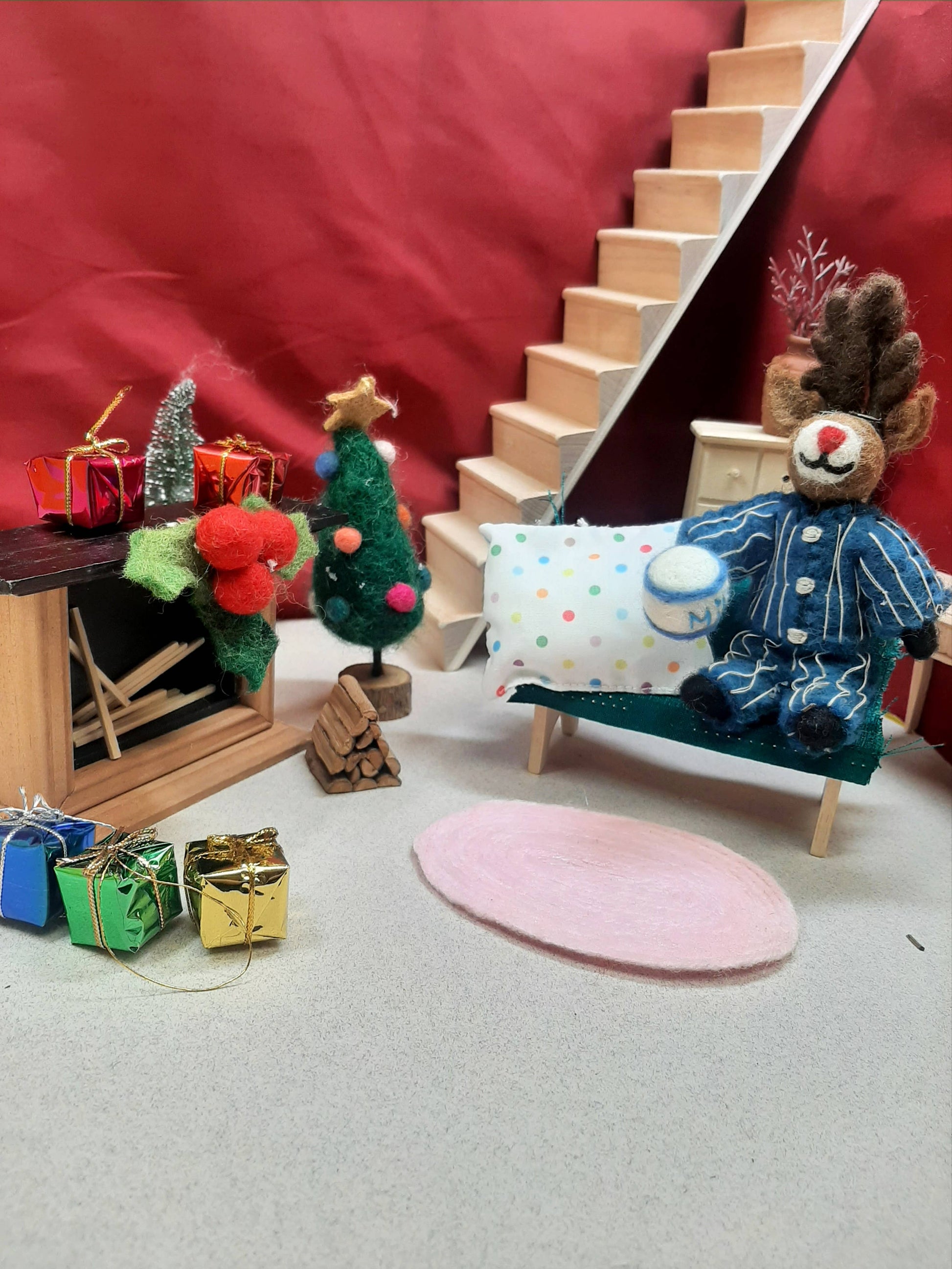 Einer der besten Teile von Weihnachten... es müssen neue Pyjamas sein! Dieser Rudolph ist bettfertig und wartet sehnsüchtig auf den Weihnachtsmorgen mit einem Glas warmer Milch, bereit zu sehen, was der Weihnachtsmann ihm gebracht hat! Moment mal... sollte er heute nicht arbeiten? Nachhaltig handgefertigt mit traditionellen Nadelfilztechniken aus kunststofffreien und umweltfreundlichen Materialien. Seine ikonische rote Rudolph-Nase wurde von Hand mit der Nadel gefilzt und die weißen Pyjamastreifen von Hand aufgenäht.