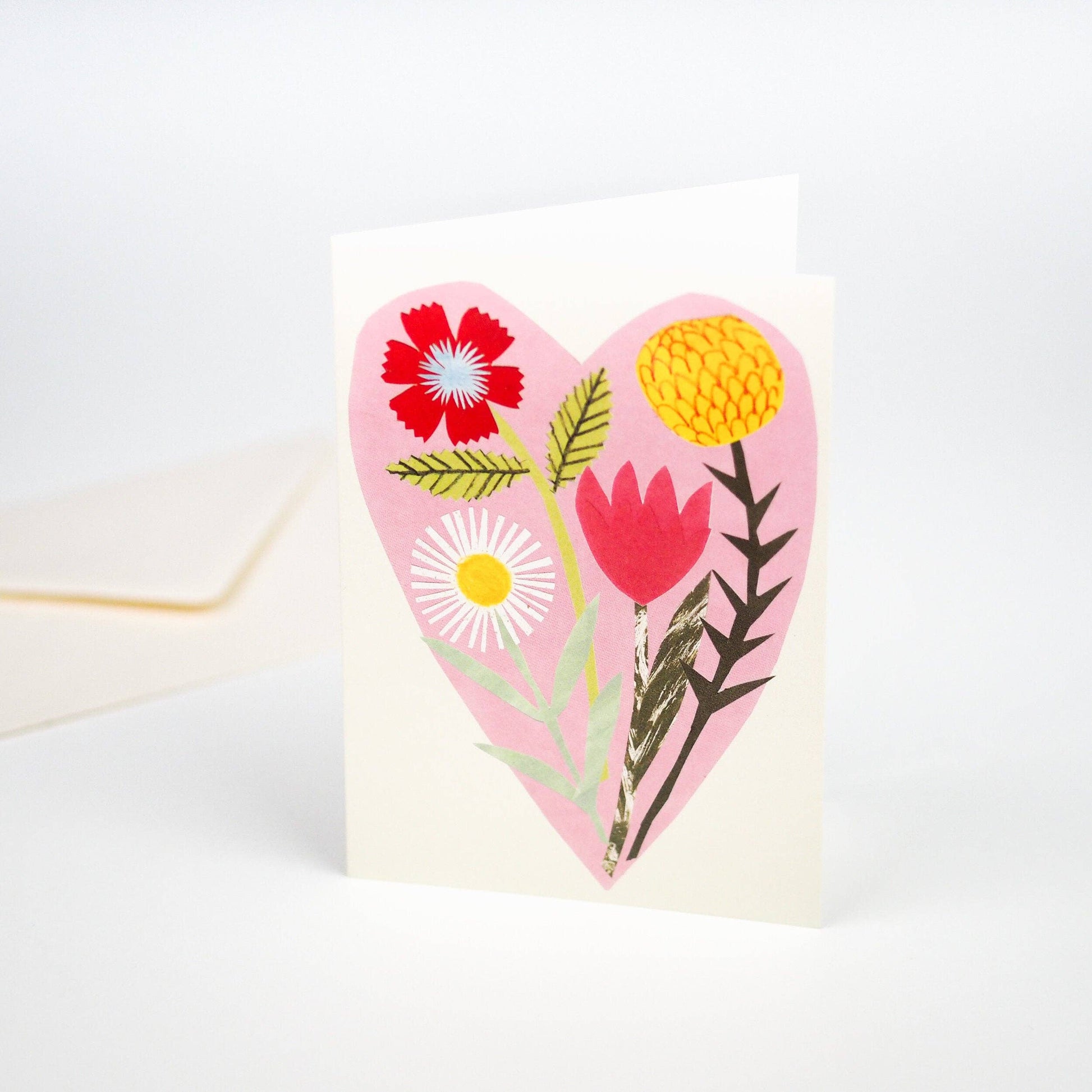 Ein wunderschöner Strauß handkollagierter Wildblumen, geschichtet auf einem weichen rosa Herz. Gedruckt auf hochwertigem 300g/m² Karton. Jede Karte misst 11,5 cm x 15 cm im gefalteten Zustand und wird in einem hübschen elfenbeinfarbenen Umschlag geliefert, das Innere ist für Ihre eigene Nachricht leer gelassen.